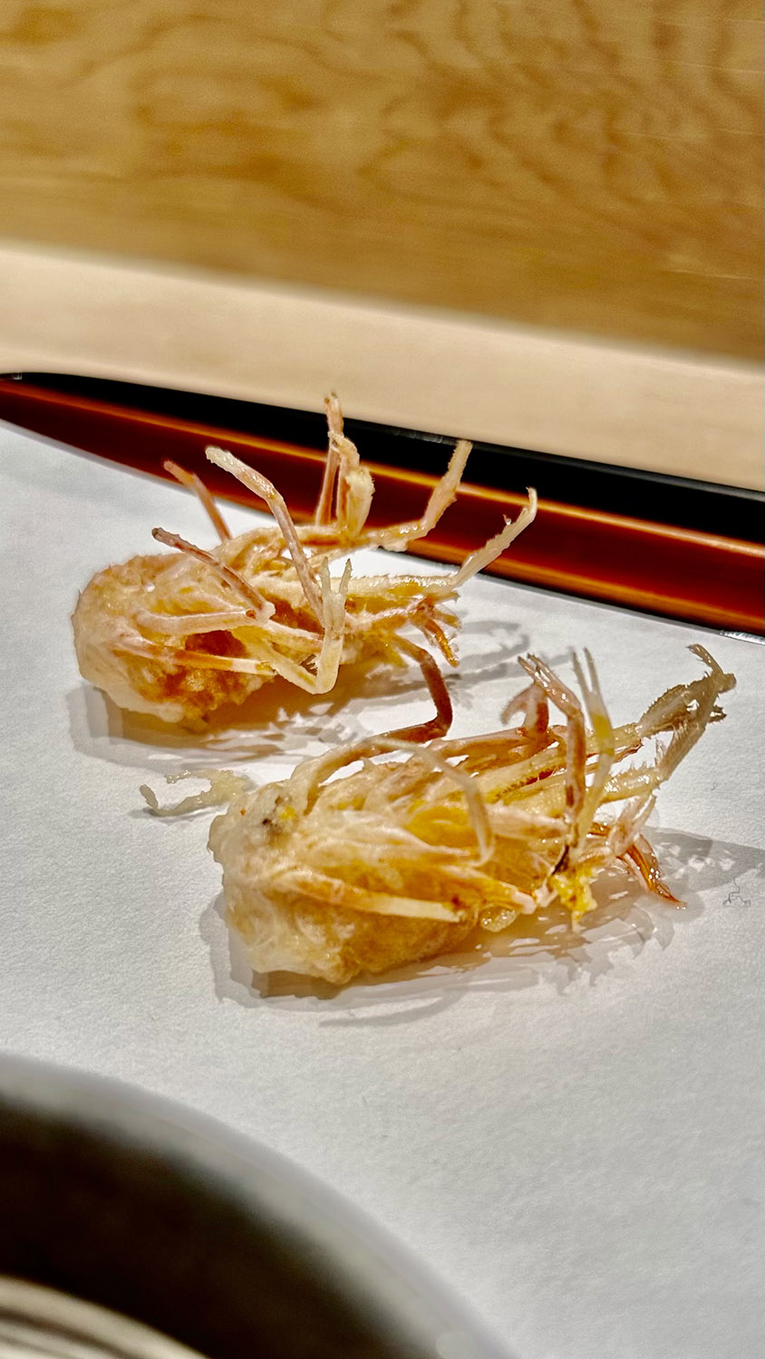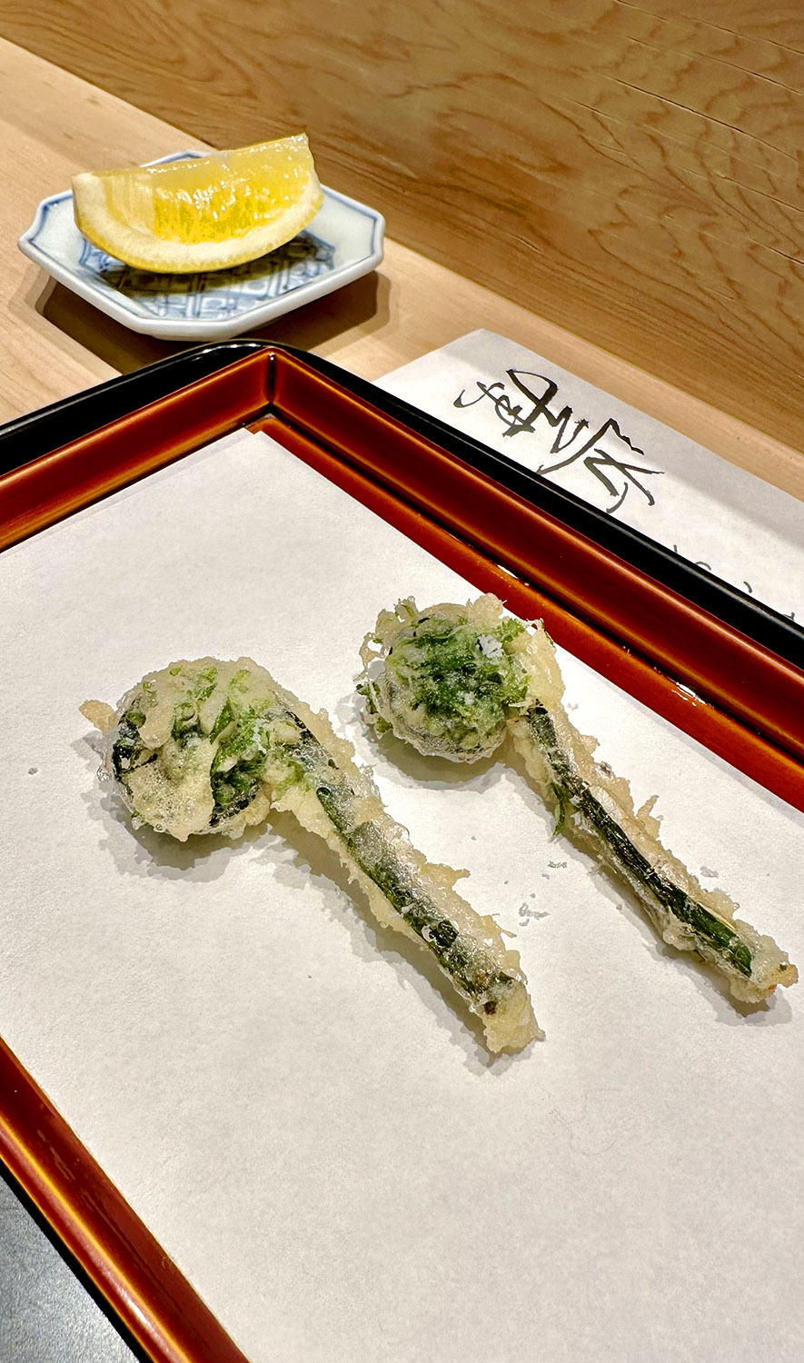 When you think of clean eating, you wouldn’t necessarily think tempura. Yet that’s the best way to describe Tempura Kondo. As you watch the chefs perform their disciplined routine of flouring, dredging, frying and changing out oil, you can’t help but get indoctrinated into the purity of the method and the taste. Simple, local ingredients of shrimp, lotus root, asparagus, eel, fish, scallop, shishito pepper and fiddlehead fronds impressed us one by one. Don’t be surprised if you don’t get tentsuyu (tempura dipping sauce), taste the clean ingredients as they were intended.