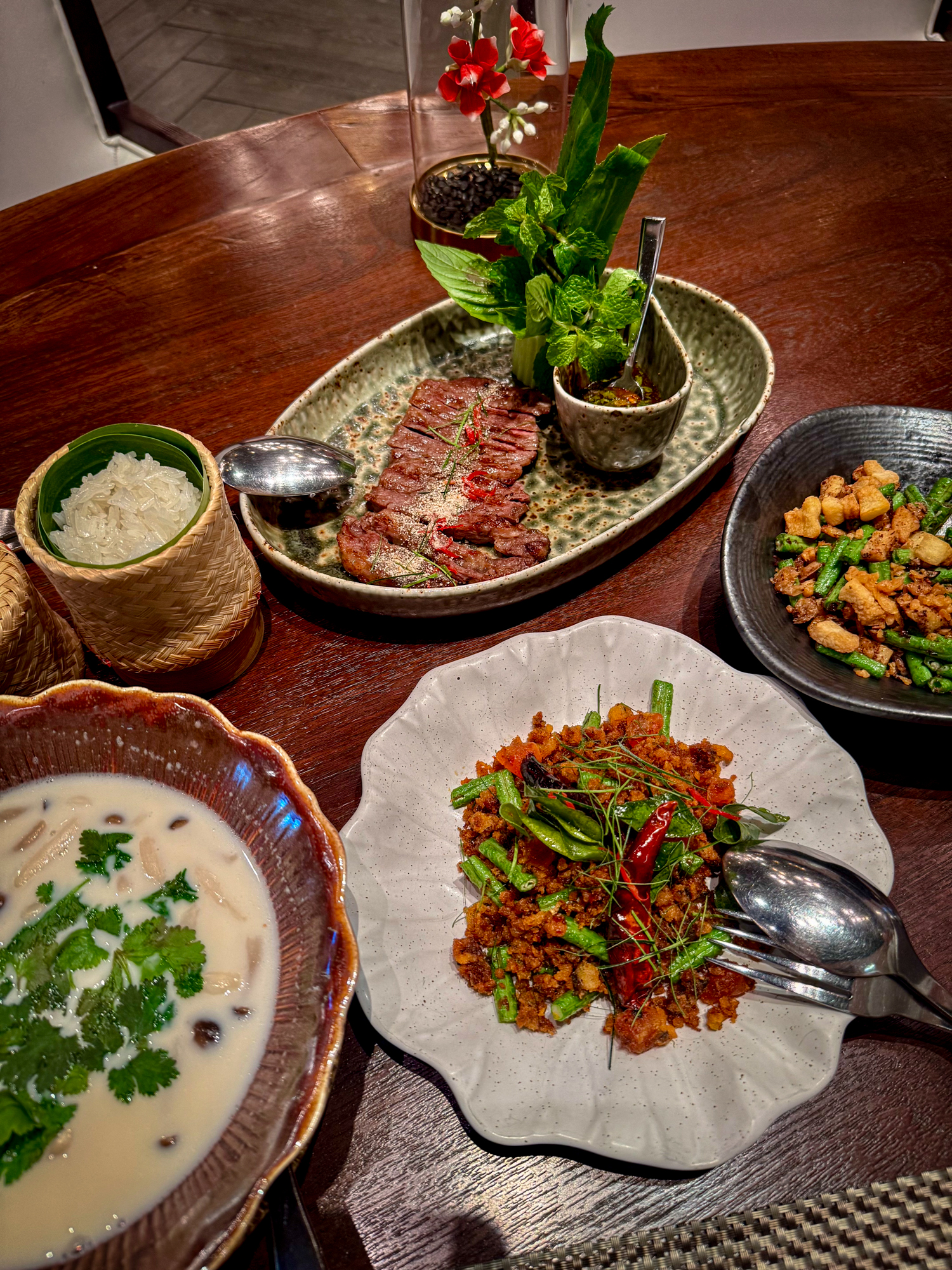 We only had a few days to see Bangkok, so we hit up the major spots and did the typical touristy activities: river cruise, Muay Thai and a cabaret show. But we also managed to slip in a quick lunch at Saneh Jaan. Almost a footnote of the Sindhorn Offices building, we missed the door the first time around. SJ is located in Pathum Wan, a premium shopping district of Bangkok. The cosmopolitan feel of the area took us away from the vibrancy of Bangkok, which made us somewhat skeptical about the food. And yet, Saneh Jaan came through with their truly robust flavors, starting with the drinks. Each dish was reminiscent of authentic flavors, but clean and refined. For me, personally, the tom kha is a litmus test for Thai restaurants, and this one was perfect. Clean, savoury, no fuss.